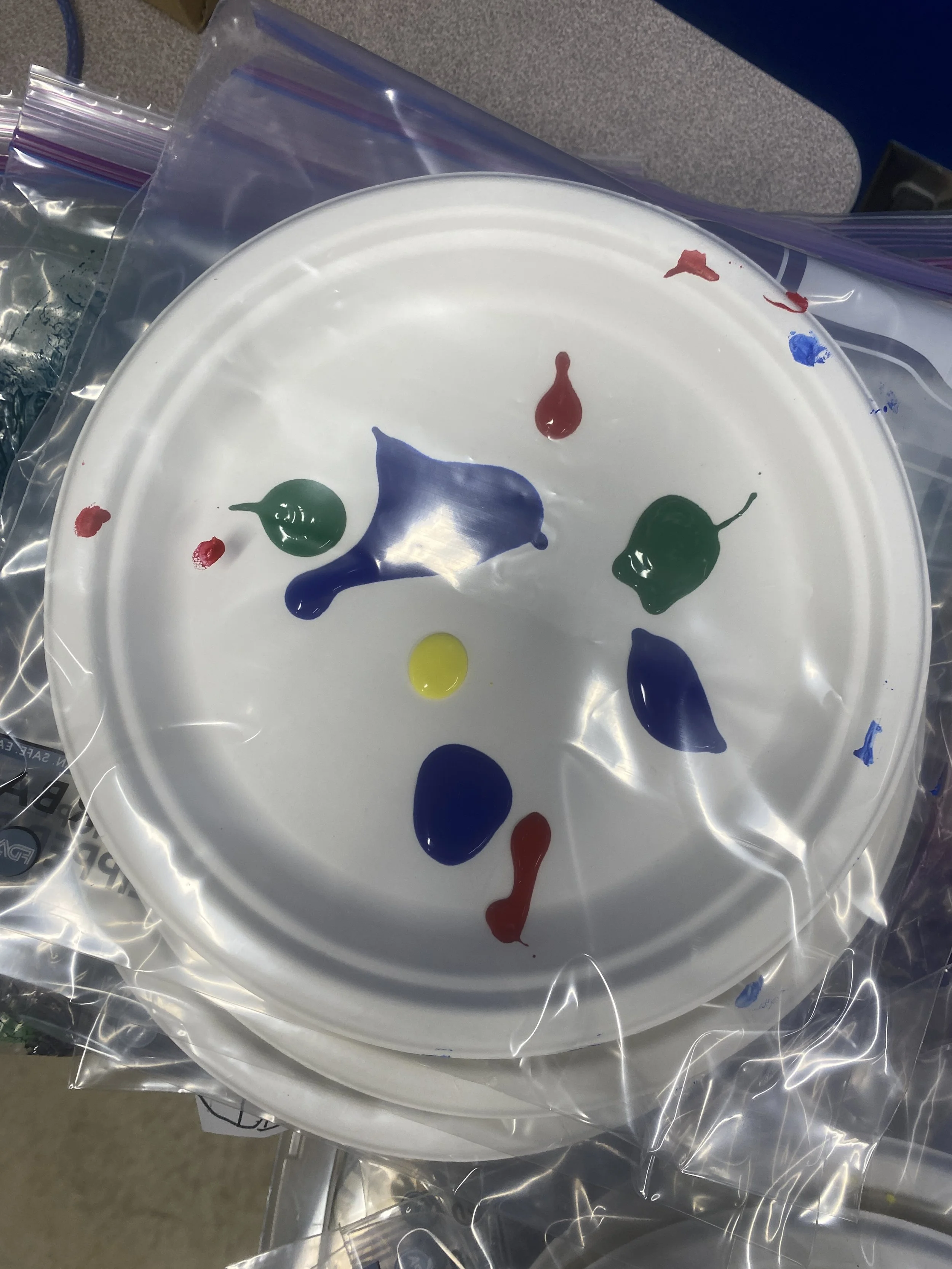1. Squeeze acrylic paint of desired colors onto a paper plate, and place the paper plate inside a ziplock bag.